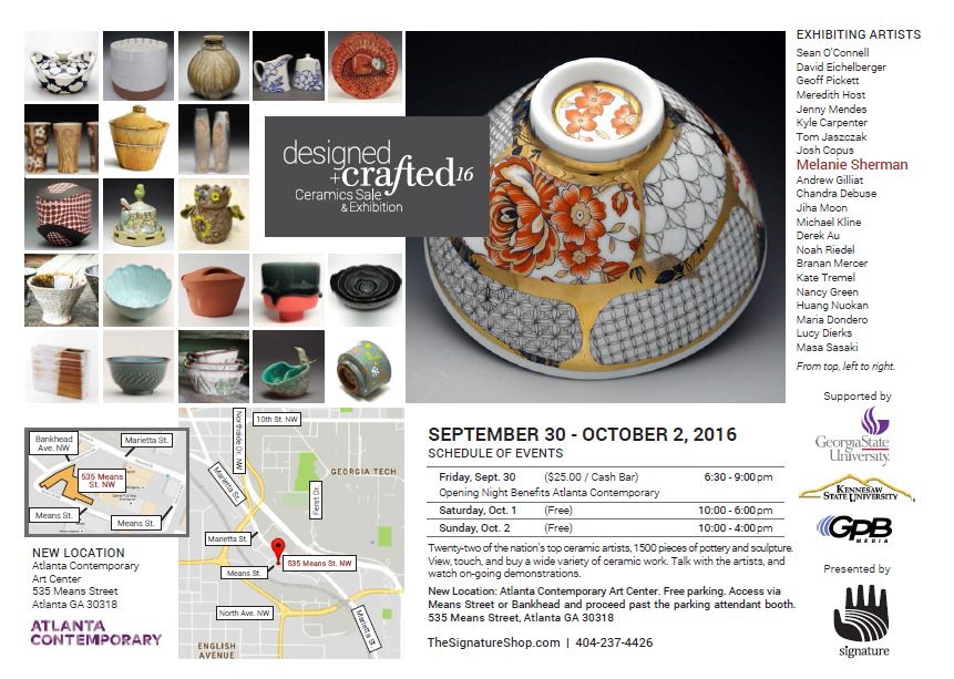 The Atlanta Contemporary Art Center & Signature will welcome an outstanding group of the nation’s top ceramic artists to Atlanta this fall. It’s an excellent opportunity to view and to touch over 1500 pieces of new ceramic work and to talk with the artists while making your purchases. There will be some familiar faces from 2015 and many new ones.